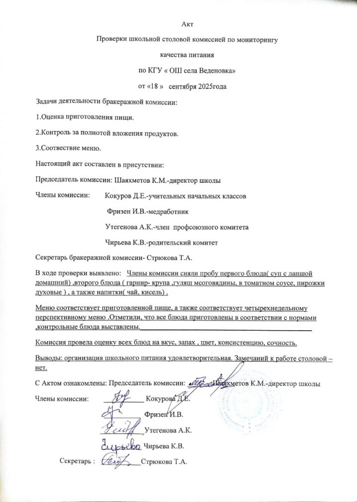 18.09.2025 ж. тамақтану сапасын мониторингілеу жөніндегі мектеп асханасының тексеру актісі