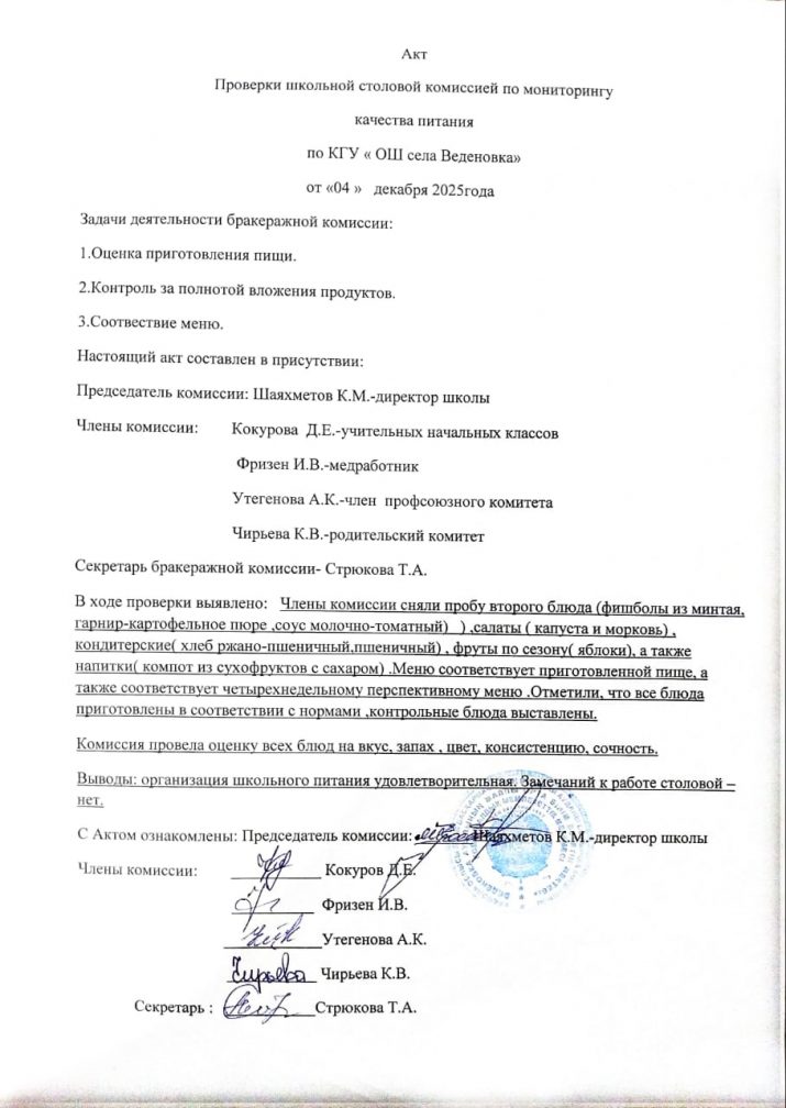 04.12.2025 ж. тамақтану сапасын мониторингілеу жөніндегі мектеп асханасының тексеру актісі