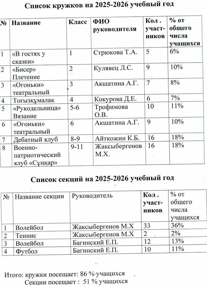 2025 - 2026 оқу жылына арналған үйірмелер мен секциялар тізімі.