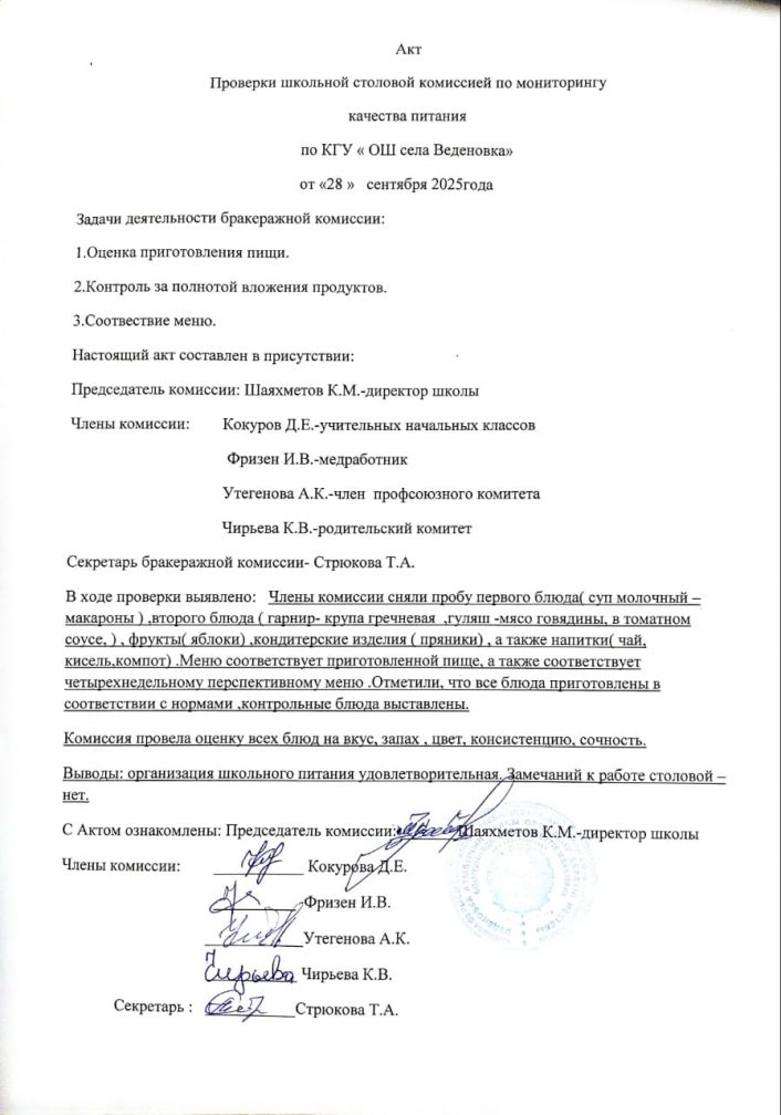 29.09.2025 ж. тамақтану сапасын мониторингілеу жөніндегі мектеп асханасының тексеру актісі