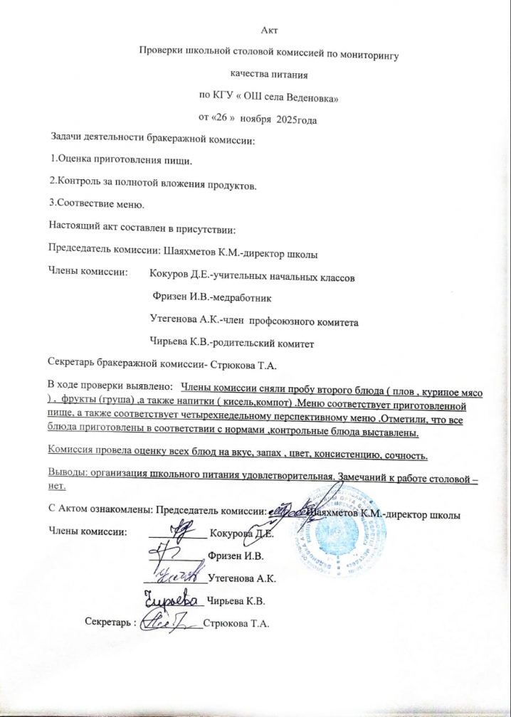 26.11.2025 ж. тамақтану сапасын мониторингілеу жөніндегі мектеп асханасының тексеру актісі