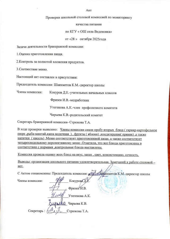 28.10.2025 ж. тамақтану сапасын мониторингілеу жөніндегі мектеп асханасының тексеру актісі