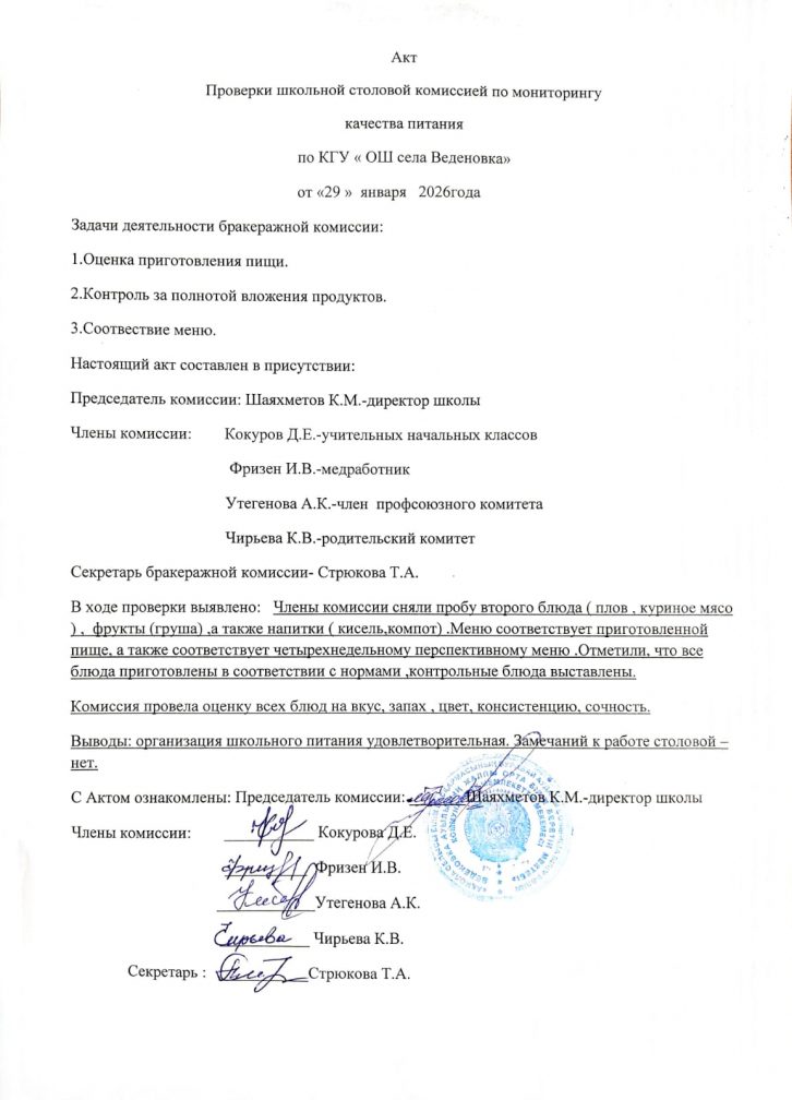 29.01.2026 ж. тамақтану сапасын мониторингілеу жөніндегі мектеп асханасының тексеру актісі