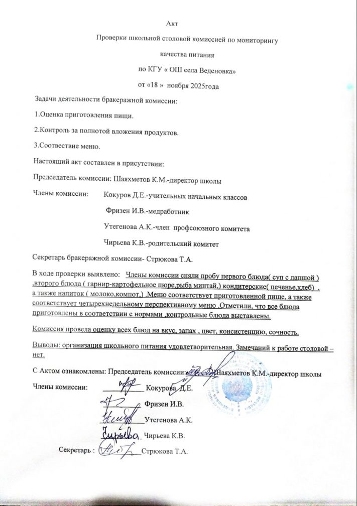 18.11.2025 ж. тамақтану сапасын мониторингілеу жөніндегі мектеп асханасының тексеру актісі
