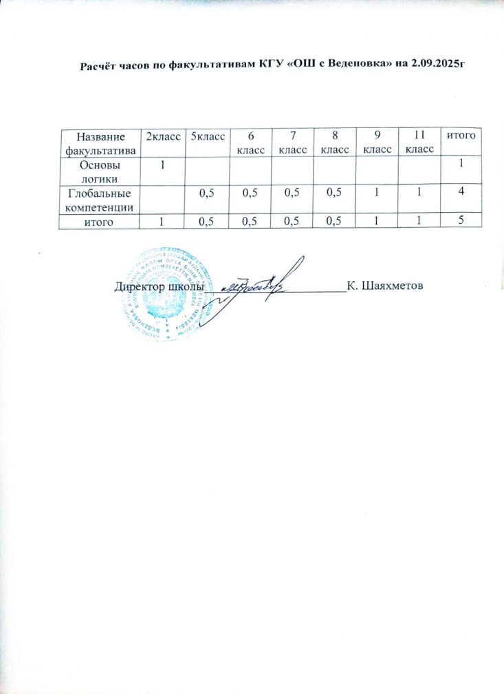 02.09.2025 ж. Веденовка селосының ЖБМ КММ факультативтері бойынша сағаттарды есептеу