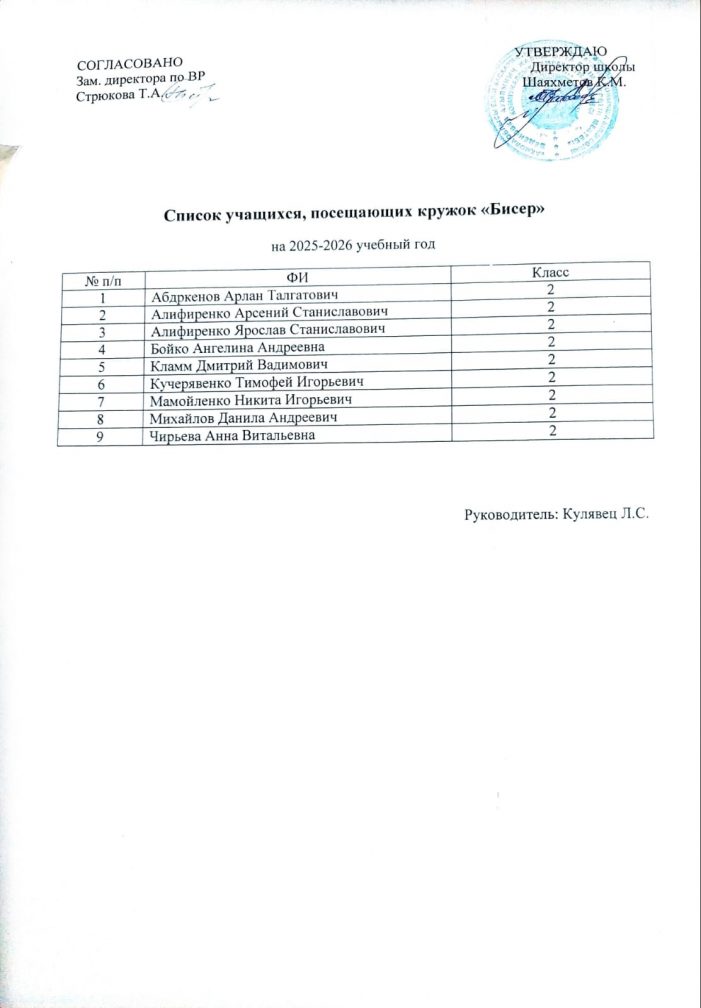 "Бисер" үйірмесіне қатысатын оқушылардың тізімі. 2025-2026 оқу жылы