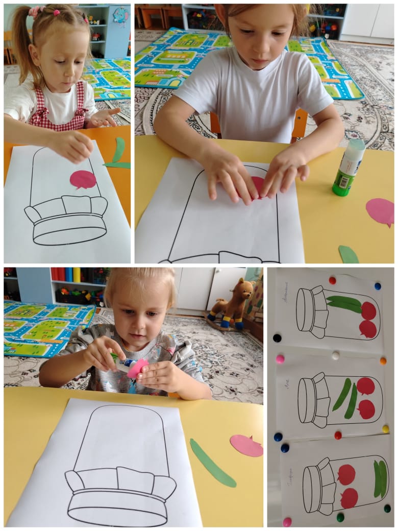 Аға топта аппликация сабағы өткізілді, оның барысында балалар өздерінің шығармашылық қиялын көрсетіп қана қоймай, көкөністерді банкаға "тұздады", бұл оларға консервілеу процесімен танысуға мүмкіндік берді. Бұл әрекет моториканы, қиялды және аспаздық негіздерін түсінуді дамытуға ықпал етті. Балалар бұл процеске қуана қатысып, көкөністерді әртүрлі тағамдарды дайындауда қалай қолдануға болатындығы туралы өз идеяларымен бөлісті.