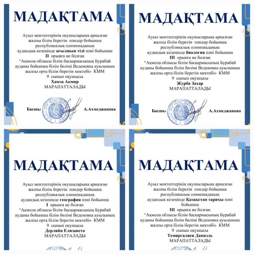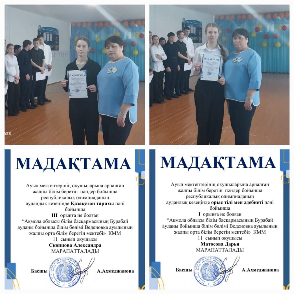 Республикалық ауылдық олимпиаданың аудандық турының жеңімпаздарын құттықтаймыз! Грамоталармен Александра Скопцова, Дарья Матасова, Даниэль Темірғалиев, Акмир Хамза, Захар Журба, Елизавета Дерлейн марапатталды. Жарайсыңдар, балалар! Жетекшілерді құттықтаймыз: Сальникова С. С., Маканова б. р., Жақсыбергенова Б. А., Өтегенова А. К., Айткожина к. б.