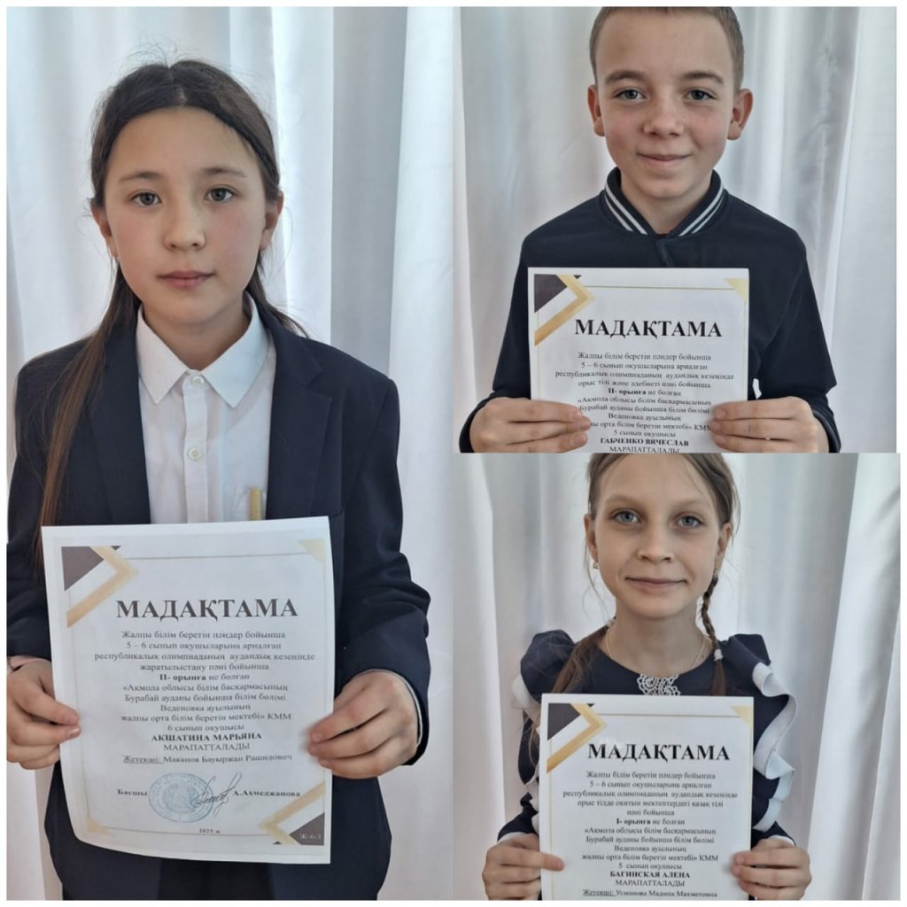Республикалық пәндік олимпиаданың аудандық турының жеңімпаздарын құттықтаймыз: Багинская Алена (қазақ тілі мен әдебиеті), Габченко Вячеслава ( орыс тілі мен әдебиеті), Ақшатина Марьяна (жаратылыстану). Жарайсыңдар, балалар!