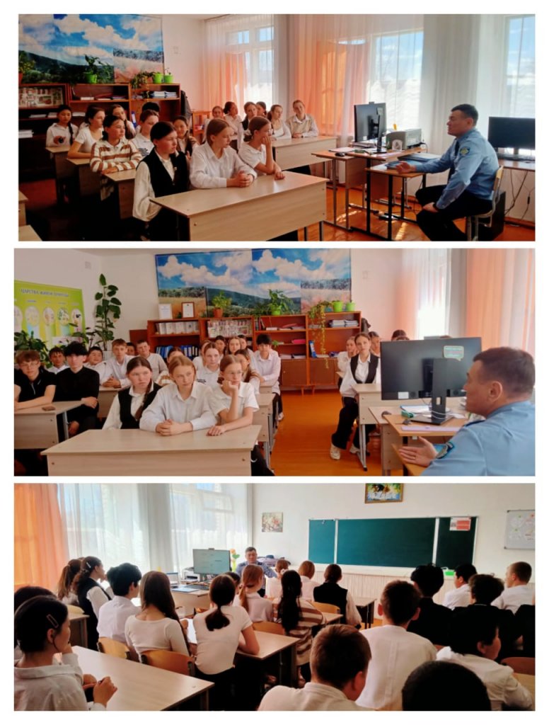 2026 жылдың 16 сәуірінде "С Веденовка ОМ"КММ-де 7-11 сынып оқушыларының полиция майоры Р.К. Смогуловпен "қауіпсіздік. ЖҚЕ, СӨС, құқық бұзушылықтың алдын алу"